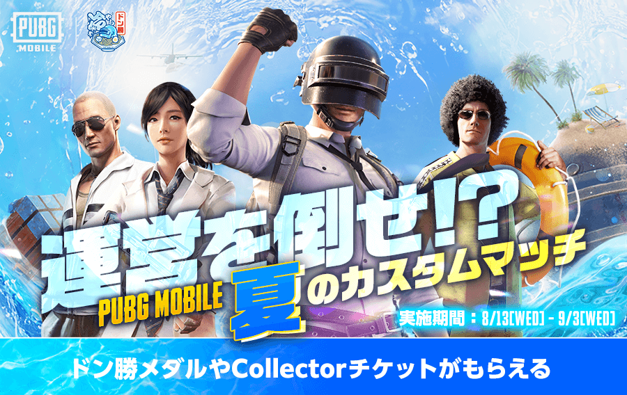 運営を倒せ!?PUBG MOBILE夏のカスタムマッチ開催! 暑い夏は運営と一緒にカスタムマッチで盛り上がろう! 参加すると「ドン勝メダル」や「Collectorチケット」がもらえるチャンス! [もっと見る]