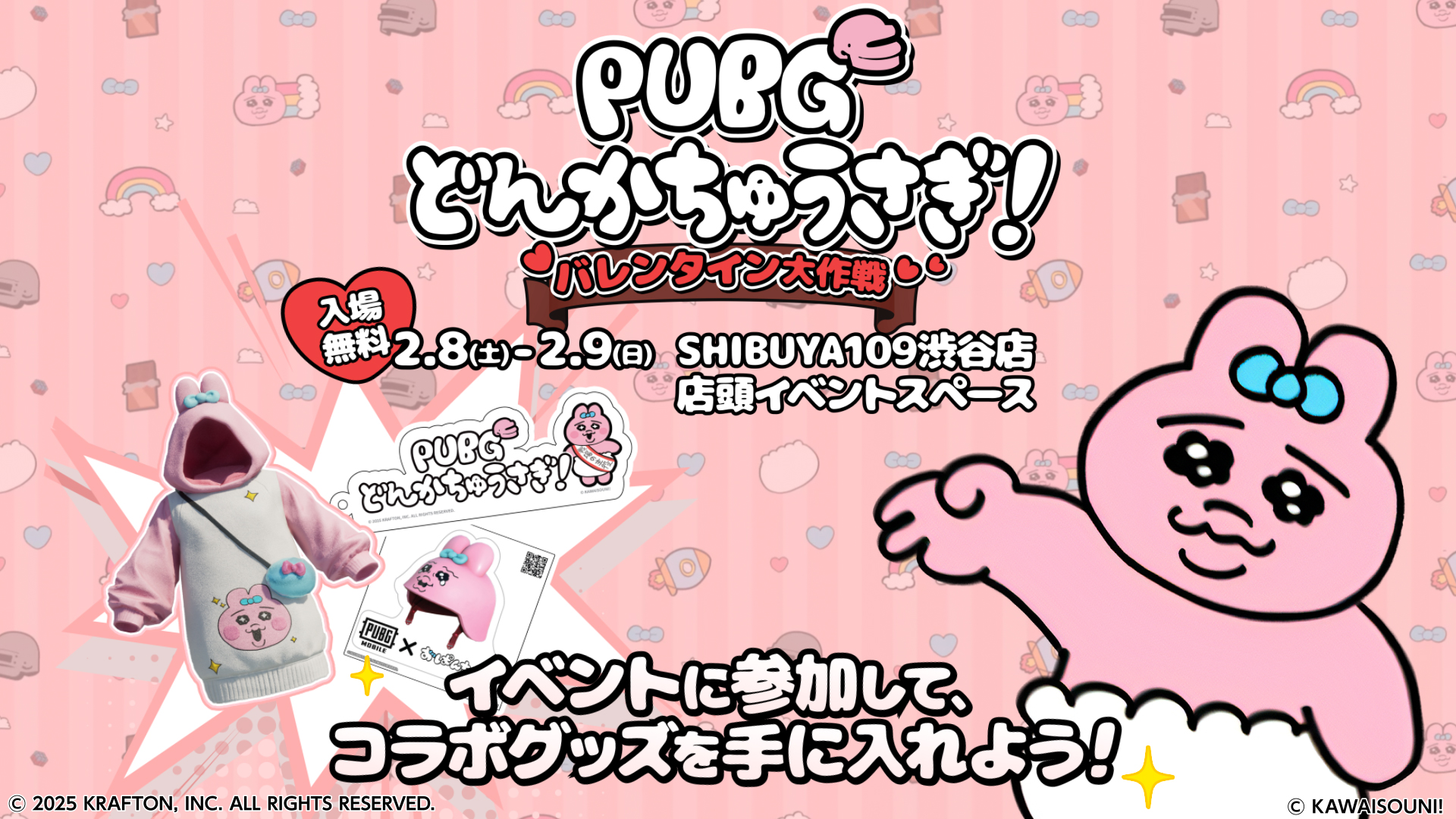 2月8日(土)~2月9日(日)にかけて、SHIBUYA109渋谷店 店頭イベントスペースにて『PUBG MOBILE』×『おぱんちゅうさぎ』のコラボオフラインイベント『PUBGどんかちゅうさぎ!バレンタイン大作戦』が開催されます。