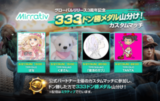 『PUBG MOBILE』グローバルリリース3周年を記念し、2021年3月21日(日)より『PUBG MOBILE』×『Mirrativ』コラボ企画333ドン勝メダル山分けカスタムマッチを開催いたします。 [もっと見る]