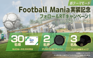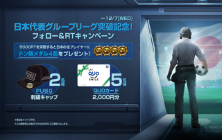 サッカー日本代表チームのグループリーグ突破を記念して、Twitterキャンペーンを実施いたします。キャンペーン期間中に公式Twitter(@PUBGMOBILE_JP)をフォロー&対象ツイートをRTしてくださった方の中から抽選で7名様に豪華賞品をプレゼントいたします。 さらに、キャンペーンツイートが5,000RT突破すると日本の全プレイヤーにゲーム内アイテム「ドン勝メダル4個」をプレゼント! キャンペーンに応募して、日本代表チームを一緒に応援しよう! [もっと見る]