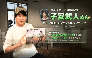 ボイスカード「子安武人A」実装を記念して「直筆サイン色紙」が当たるキャンペーンを実施します。 キャンペーン期間中に公式Twitter(@PUBGMOBILE_JP)をフォロー&対象のツイートをRTしてくださった方の中から抽選で1名様に子安武人さんの直筆サイン色紙をプレゼント!   ■開催期間 [もっと見る]