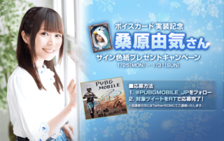 ボイスカード「キュートペンギン(cv.桑原由気)」実装を記念して「直筆サイン色紙」が当たるキャンペーンを実施します。 キャンペーン期間中に公式Twitter(@PUBGMOBILE_JP)をフォロー&対象のツイートをRTしてくださった方の中から抽選で1名様に桑原由気さんの直筆サイン色紙をプレゼント!   ■開催期間 [もっと見る]