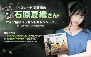 ボイスカード「メルヘンチェシャ猫(cv.石原夏織)」実装を記念して「直筆サイン色紙」が当たるキャンペーンを実施します。 キャンペーン期間中に公式Twitter(@PUBGMOBILE_JP)をフォロー&対象のツイートをRTしてくださった方の中から抽選で2名様に石原夏織さんの直筆サイン色紙をプレゼント!   ■開催期間 [もっと見る]
