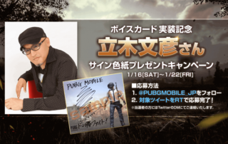 📅 キャンペーンは終了しました。たくさんのご応募ありがとうございました。 ボイスカード「立木文彦A」実装を記念して「直筆サイン色紙」が当たるキャンペーンを実施します。 キャンペーン期間中に公式Twitter(@PUBGMOBILE_JP)をフォロー&対象のツイートをRTしてくださった方の中から抽選で1名様に立木文彦さんの直筆サイン色紙をプレゼント! [もっと見る]